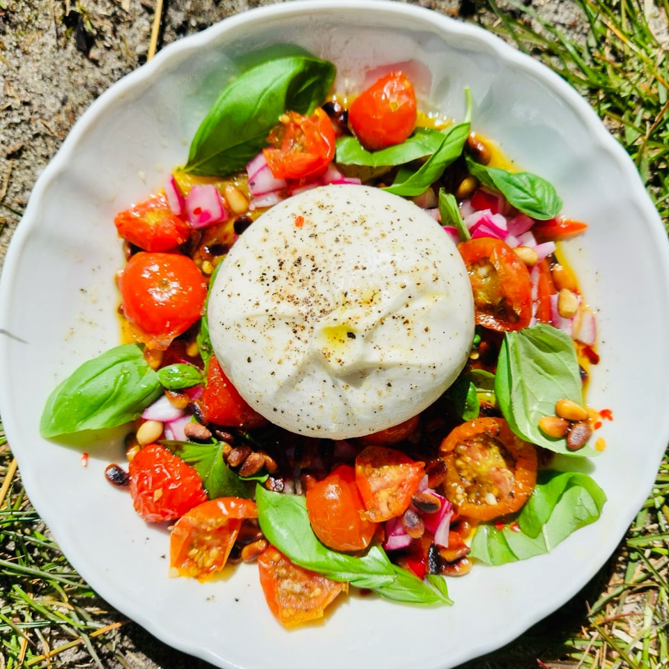 • When ready to serve: Halve the paprika mix and its liquid. Dish out into two bowls. Top each bowl with half of the marinated onions and their liquid. Sprinkle over chilli flakes if using (chilli flakes are very different depending on the brand you use. Only use enough to add a slight hint of spice to the dish. It shouldn’t be overbearingly spicy)! Place a ball of Burrata into the middle of each bowl, drizzle a good tablespoon and a half of excellent olive oil on top. Scatter the roasted tomatoes around the burrata. Sprinkle the pine nuts over both bowls. Rip lots (!!) of fresh basil leaves over the bowl, sprinkle carefully with pink Himalayan salt and a good grinding of pepper. And there you have it! You will NOT be disappointed!!