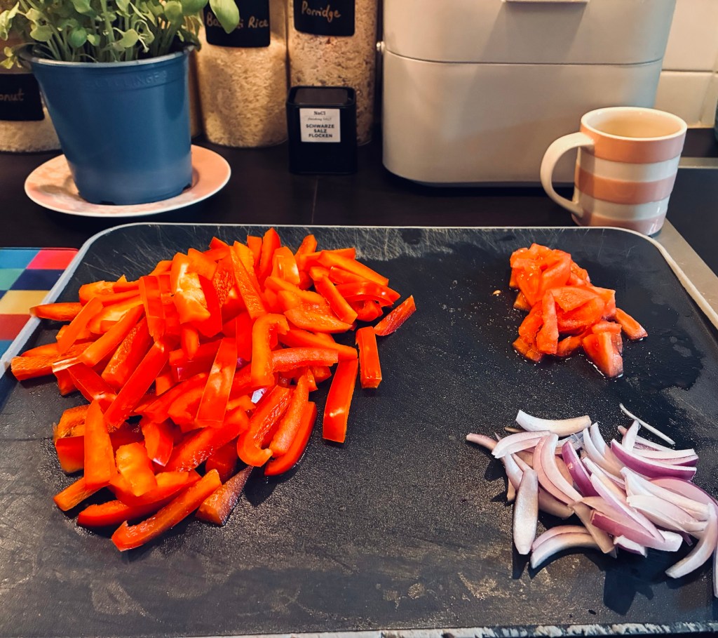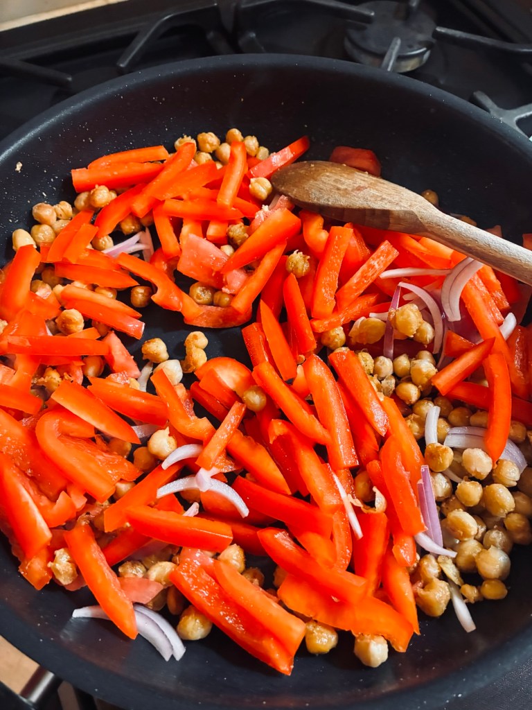 • Once well browned, add your red peppers, onion and tomato. Stir well and leave to soften up for about 5-6 minutes. Stir often to avoid burning.