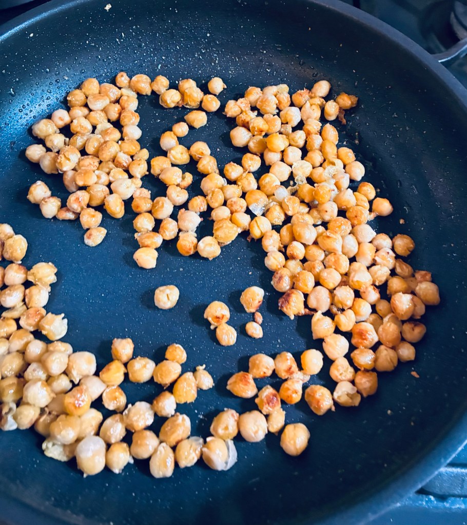 • When the oil is hot, add the chickpeas, 1/2 teaspoon of salt and give a good stir. Leave the chickpeas to brown, stir and allow them to brown well from the other side: