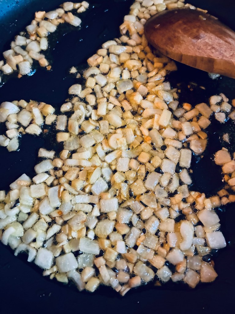 • In a frying pan, heat up 2 Tbsp of olive oil. Once well warmed, add the chopped onions, garlic and ginger. Fry for 8-10 minutes until very lightly golden and softened.
