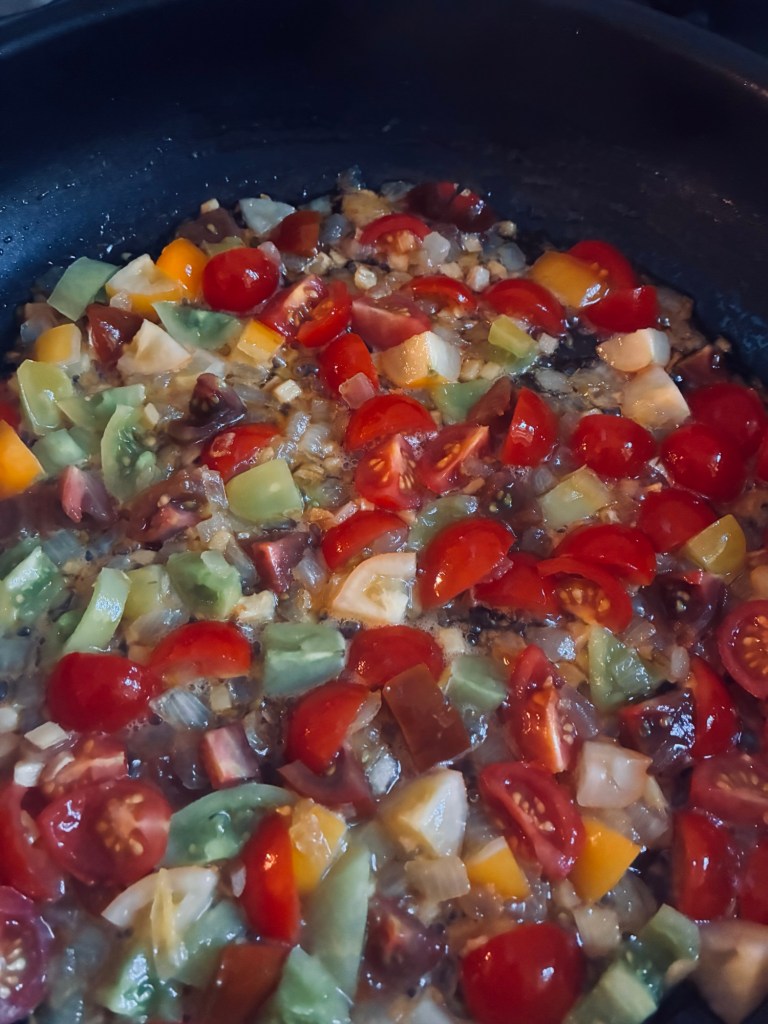 • Add your well mixed sauce ingredients to the tomatoes once the tomatoes have softened and look slickly coated in the sugary juices.