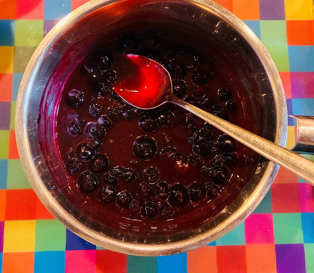 • in a small saucepan combine the remaining 115g of fresh blueberries, cornflour, maple syrup, 3 Tbsp cold water and a pinch of salt. Bring everything to a gentle boil while stirring frequently. Try not to stir too aggressively so that the blueberries retain their shape 🙂 . Once the mixture has boiled, cook for a further 2-3 minutes and then remove from the heat. Stir in the remaining 3 Tbsp. of orange juice and stir again (gently) until you have a sticky sauce.