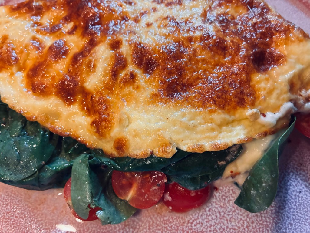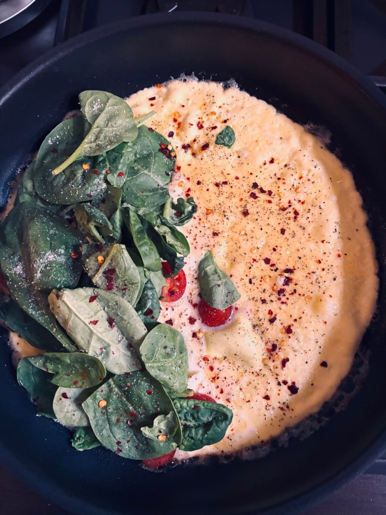 • place the cheese on the left half of the omelette. Do this first so that the cheese can start to soften. Now layer the spinach, tomatoes and basil leaves on top (only on the left hand side)