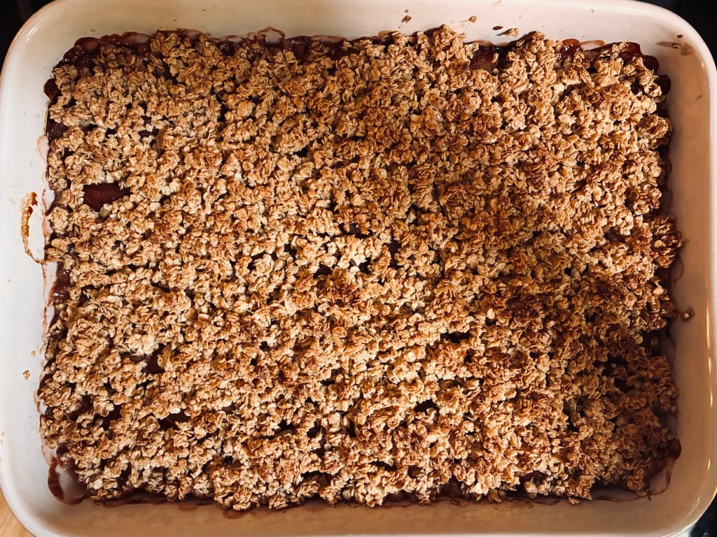 • Place the plums into a casserole dish, cover completely with the oat mix (in an even layer)