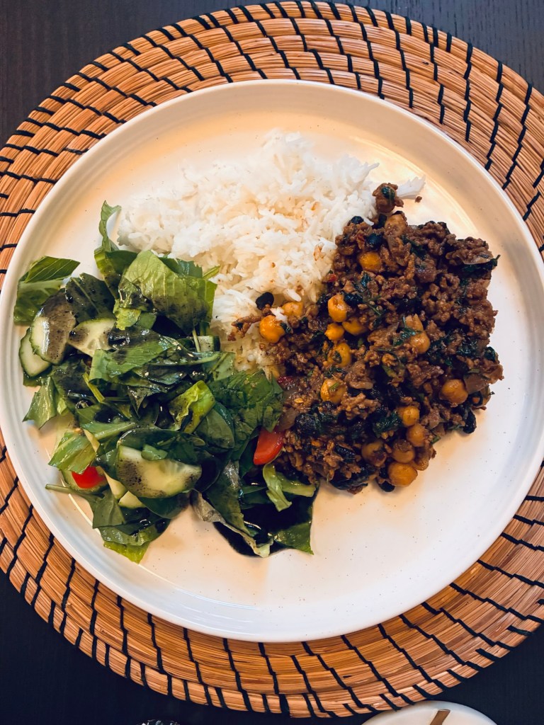 I‘m only including the recipe for the meat mixture here. Make any type of salad that tickles your fancy to go along with it! Mine was crunchy lettuce leaves, baby spinach leaves, cucumber and cherry tomatoes. For the dressing I mixed 1 tsp. of black sesame paste with 2 tsp. of maple syrup. I then stirred in 2 Tbsp. of white wine vinegar and finally drizzled in olive oil, slowly, stirring until I got the consistency I was after (not too thick, not to watery!). Season to taste. You could definitely use tahini instead of the black sesame paste – I just prefer the earthy flavour of the black paste.